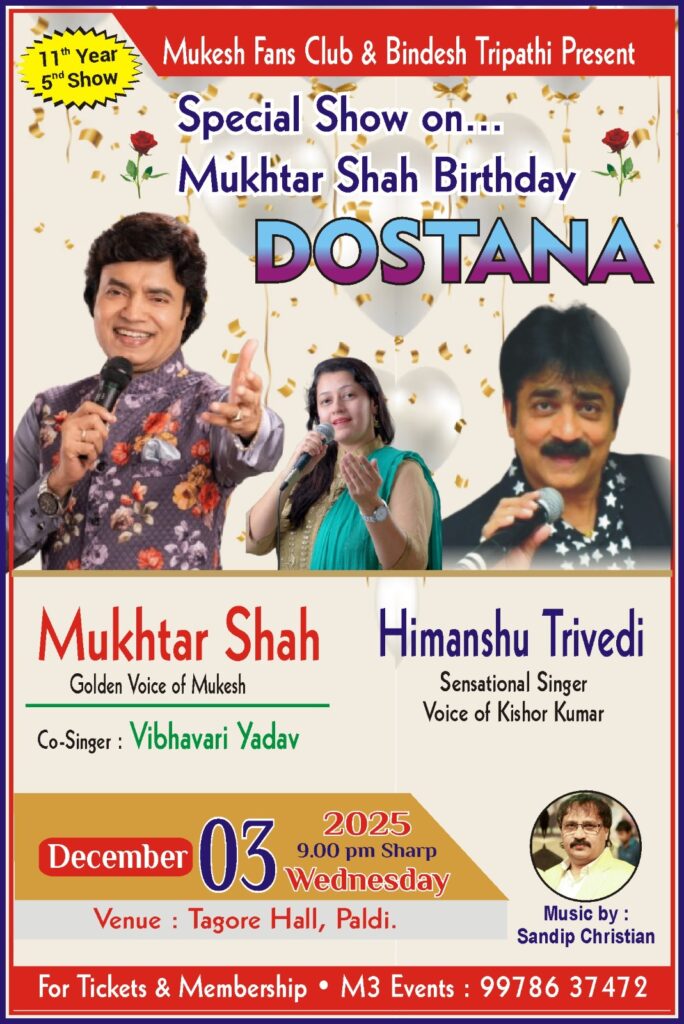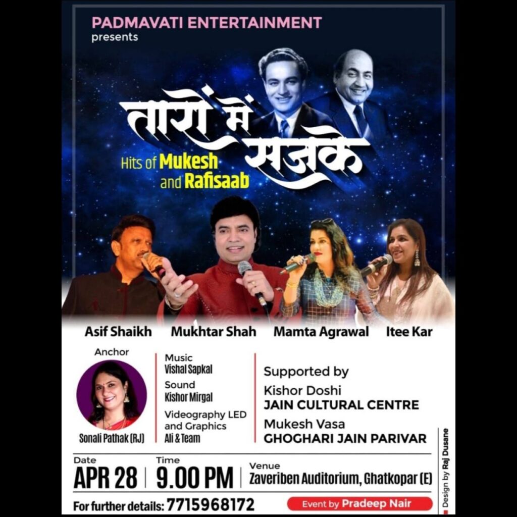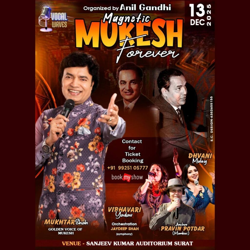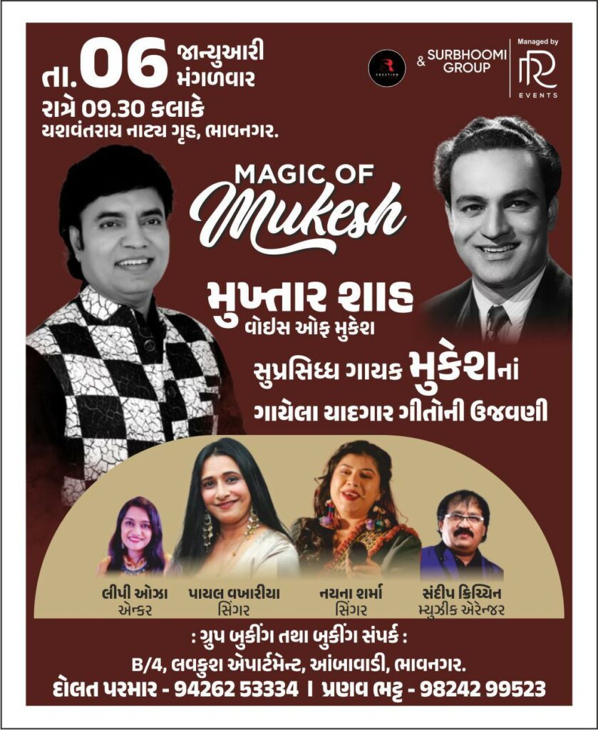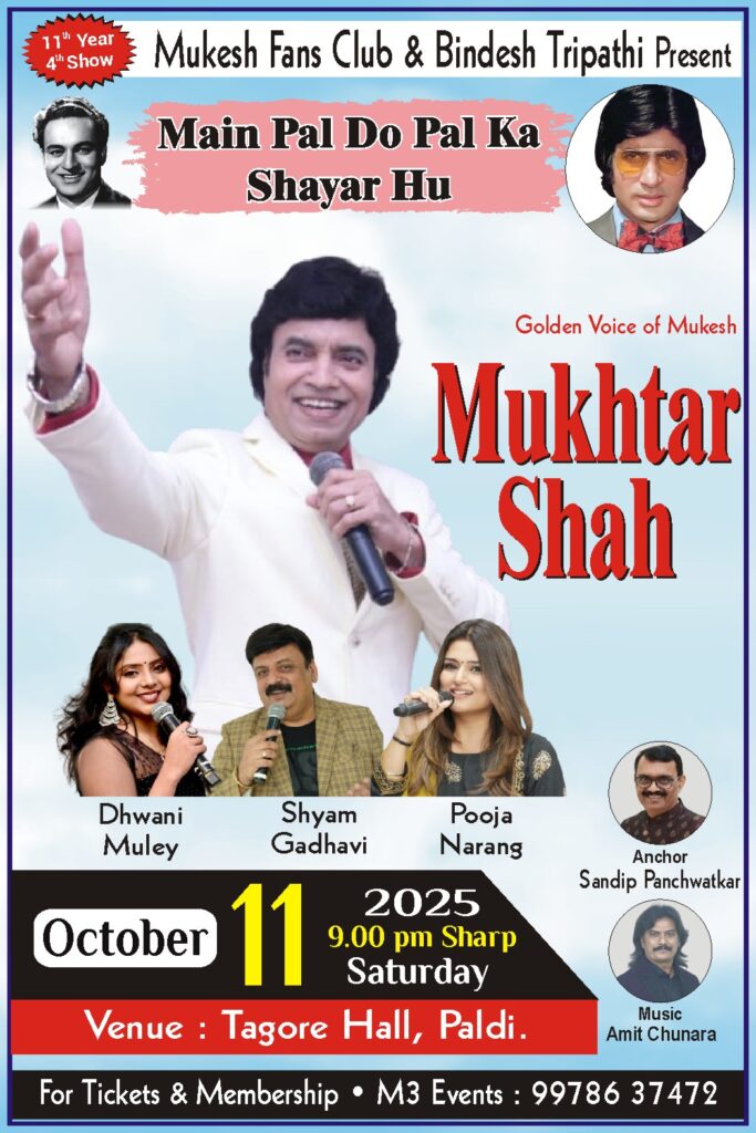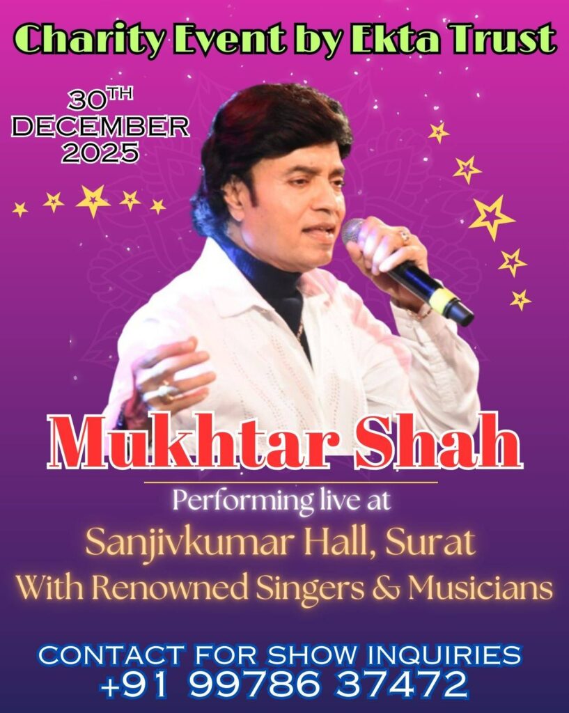 Mukhtar Shah’s voice was identified same as “Mukesh” from audience when he sung mukesh’s song “Main Pal Do Pal Ka Shayar Hoon” from Kabhi Kabhi. His voice from one hand is deeply sorrowful and on the other hand conveys strongly innocent and honeyed sweetness for which he received so many awards, appreciation and recognition certificates and trophies. He started his career performing publicly in 1984, as a singer at various shows with BABRA and PARTY. He has performed more than 5000 shows till now. He have sung around 17 Audio Albums and sung in Two Gujarati films till now.