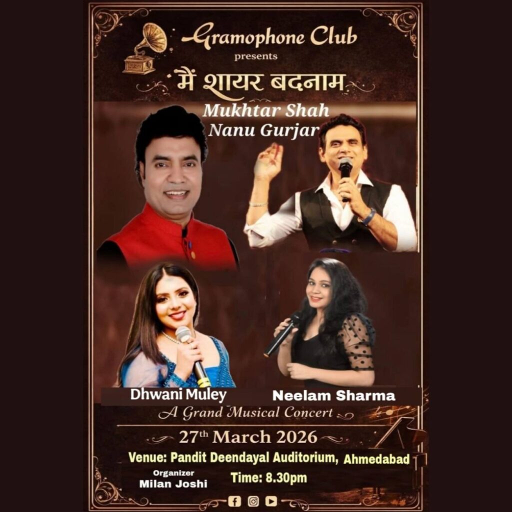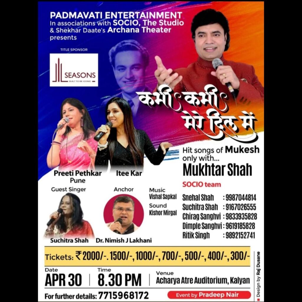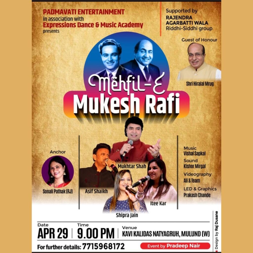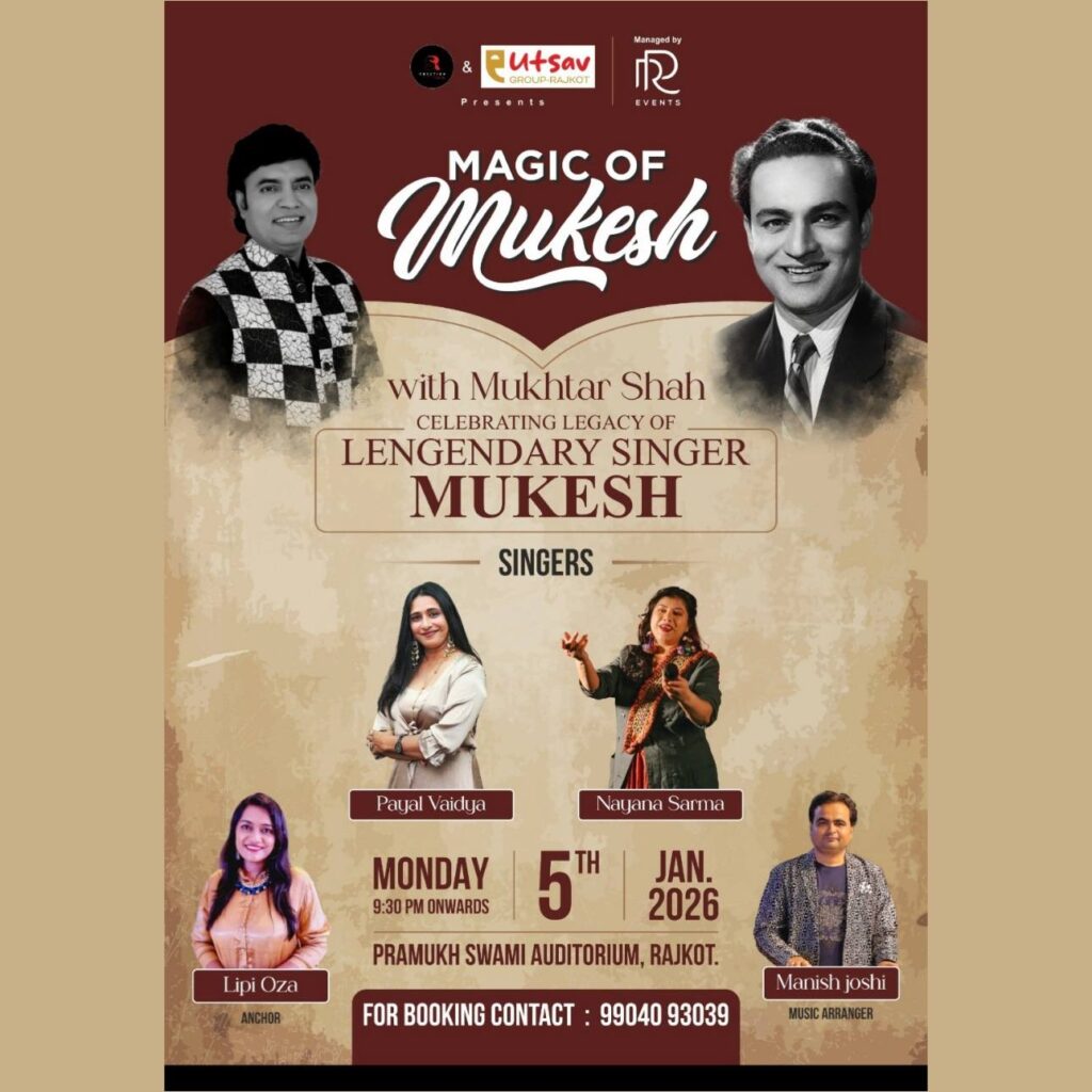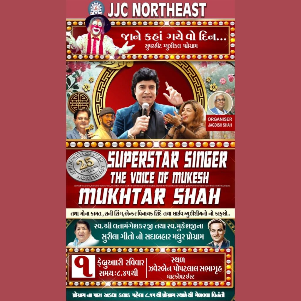 Mukhtar Shah’s voice was identified same as “Mukesh” from audience when he sung mukesh’s song “Main Pal Do Pal Ka Shayar Hoon” from Kabhi Kabhi. His voice from one hand is deeply sorrowful and on the other hand conveys strongly innocent and honeyed sweetness for which he received so many awards, appreciation and recognition certificates and trophies. He started his career performing publicly in 1984, as a singer at various shows with BABRA and PARTY. He has performed more than 5000 shows till now. He have sung around 17 Audio Albums and sung in Two Gujarati films till now.